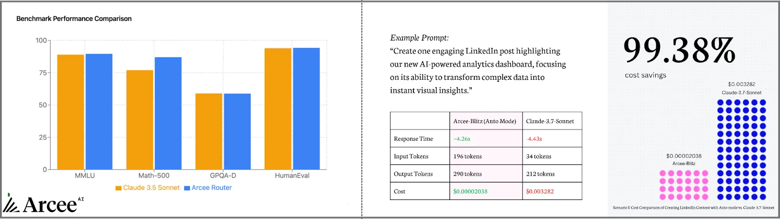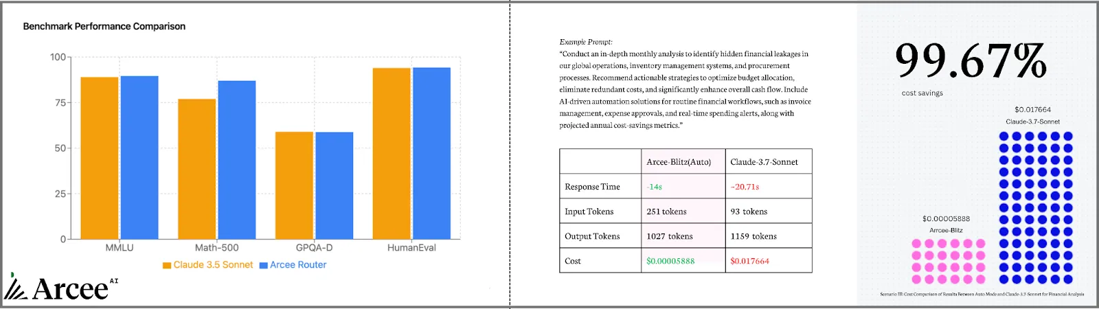 Let's cut through the theory and see real results. The following analysis showcases Arcee Conductor in action with real-world examples, side-by-side model comparisons, and metrics that demonstrate exactly how much you can save without sacrificing quality.