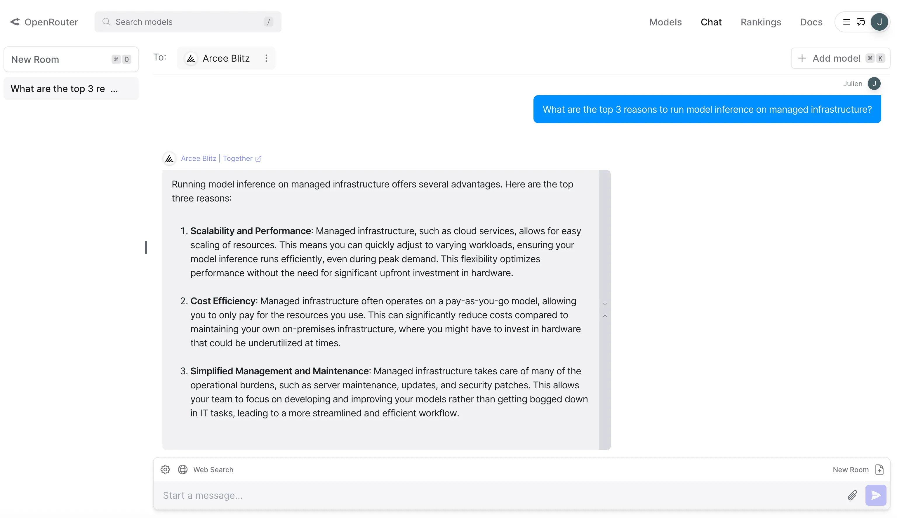 Managed inference platforms like Together.ai and OpenRouter dramatically simplify the development process. They handle the complex infrastructure requirements of model deployment, from GPU provisioning and scaling to load balancing and redundancy. In fact, Arcee is using Together.ai to host all the models available in Arcee Conductor, our model routing inference platform!