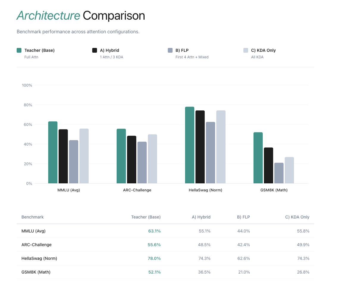 Does this mean that KDA is inherently worse than a hybrid or full-attention model at math? No, we definitely can't conclude that. Remember that this is a very small amount of compute involved, and it's likely that on a longer training horizon all configurations will recover even a little more performance. Plus benchmarks like GSM8K are highly sensitive to the formatting of training data, and I kinda just shoveled what I had sitting around into a pile. But we definitely can say that the KDA and NoPE hybrid recovered dramatically more performance than the pure-KDA model given the same training data and hyperparameters.