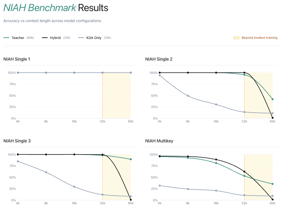 This actually is more or less exactly what you would expect from a pure state space model, and a more or less inevitable result of the inherent conflict between a fixed-size hidden state and an ever-growing past. From comparing the hybrid and kda results, we can make the interesting inference that full attention in NoPE layers is likely responsible for the crash past 32k. KDA seems to natively generalize to longer sequence lengths (with the caveat above), but NoPE layers really need to have seen at least a few sequences at that length to not fall apart. Neat! Also more or less matches the folk knowledge that you should train that type of model at 2x the sequence length you plan to inference it at.