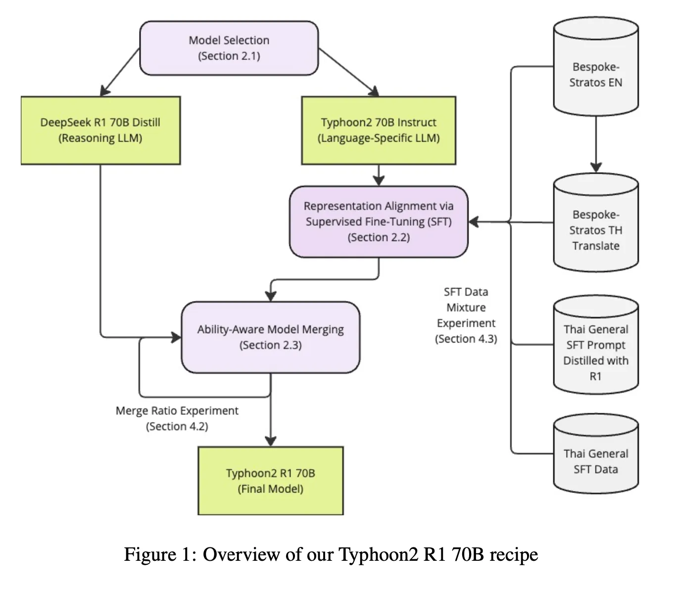 The merging recipe consisted of DeepSeek R1 70B and Typhoon2 70B Instruct, a Thai language-specific LLM. The merge ratio was optimized to enhance the reasoning capability of the language-specific models while still maintaining strong performance in the target language. Their two-phase approach consisted of: