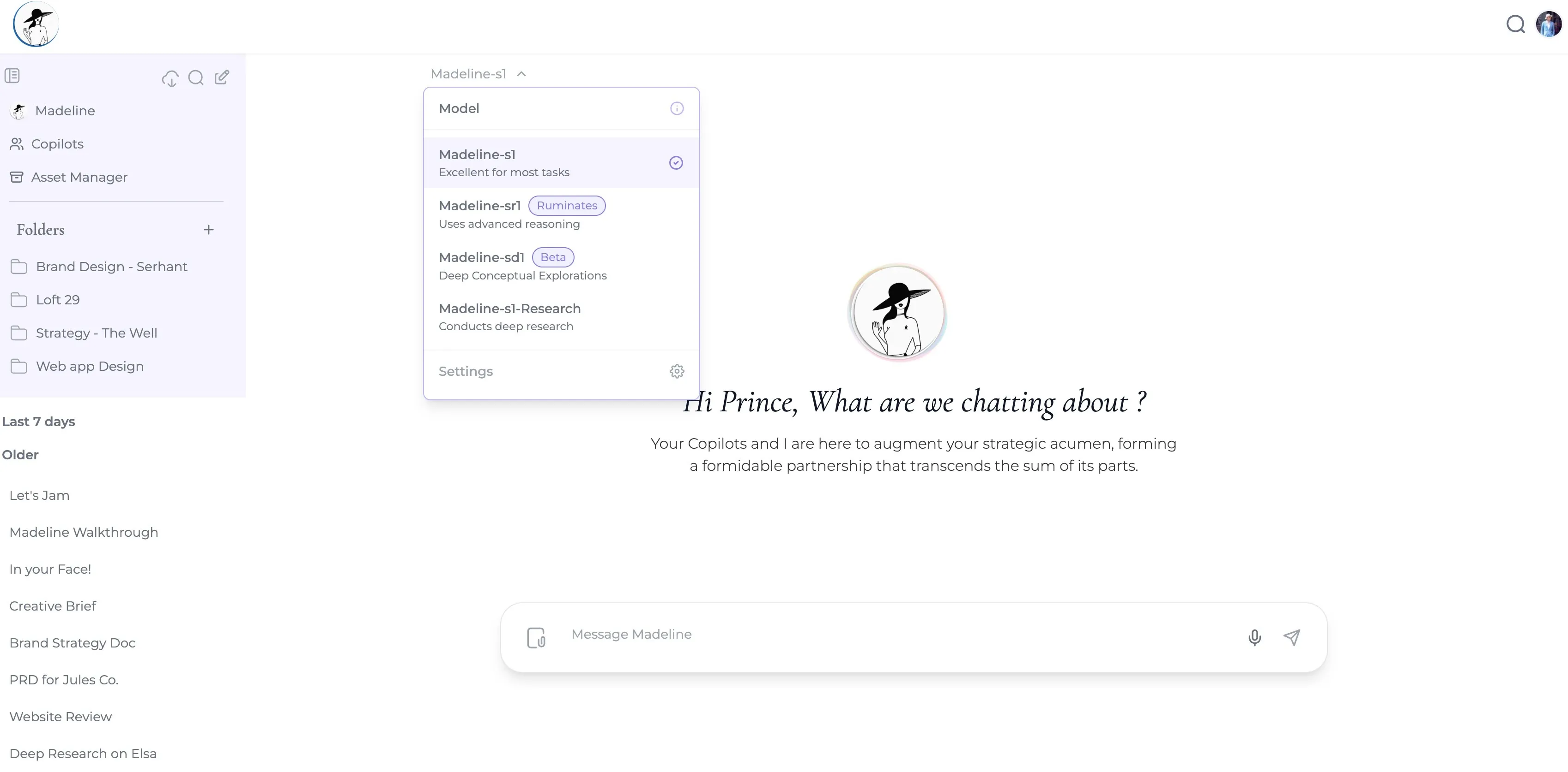 After 2 months of training, the joint team presented Madeline-s1, a 32-billion-parameter reasoning model explicitly trained to reflect how Madeline expert strategists and designers think, mapping tradeoffs, surfacing multiple valid options, and grounding decisions in strategic insights and customer research. Rather than producing templated or generic answers, we engineered Madeline-s1 to generate meaningful interpretations and actionable insights across disciplines.